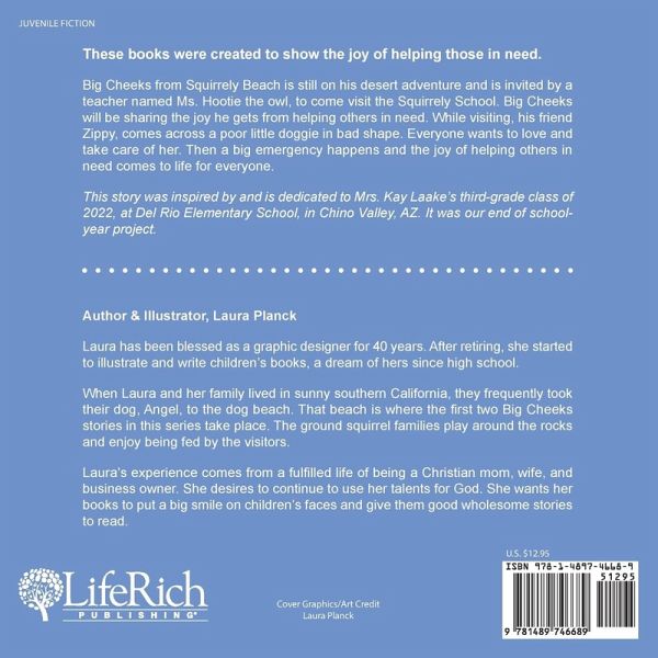 Big Cheeks from Squirrely Beach is still on his desert adventure and is invited by a teacher named Ms. Hootie, to come visit the Squirrely School. Big Cheeks will be sharing the joy he gets from helping others in need. While visiting, his friend Zippy, comes across a poor little doggie in bad shape. Everyone wants to love and take care of her. Then a big emergency happens and the joy of helping others in need comes to life for everyone. This story was inspired by and is dedicated to Mrs. Kay Laake's third-grade class of 2022, at Del Rio Elementary School, in Chino Valley, AZ. It was our end of school-year project.