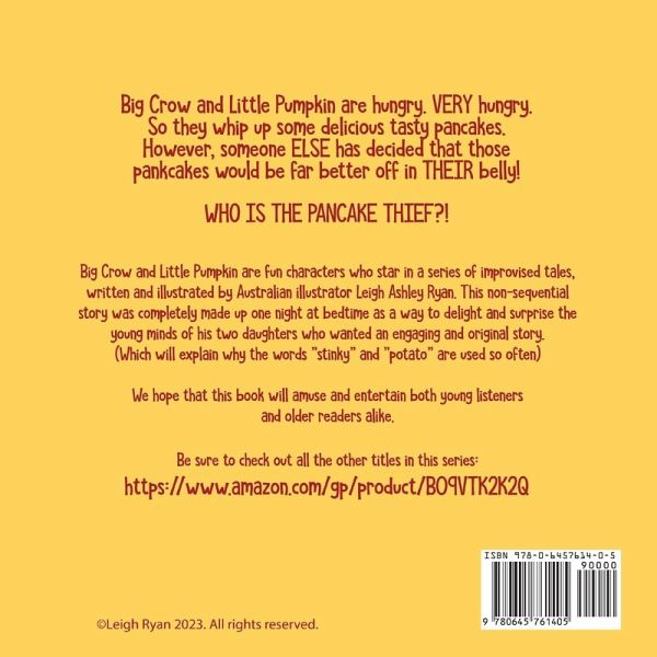 Big Crow and Little Pumpkin are fun characters who star in a series of improvised tales written and illustrated by Australian illustrator Leigh Ashley Ryan. This non-sequential story was entirely made up one night at bedtime as a way to delight and surprise the young minds of his two daughters, who wanted an engaging and original account (Which will explain why the words "stinky" and "potato" are used so often). We hope this book will amuse and entertain young listeners and older readers alike. **UPDATE** Now with fun, added extra Pancake Recipe to make at home!