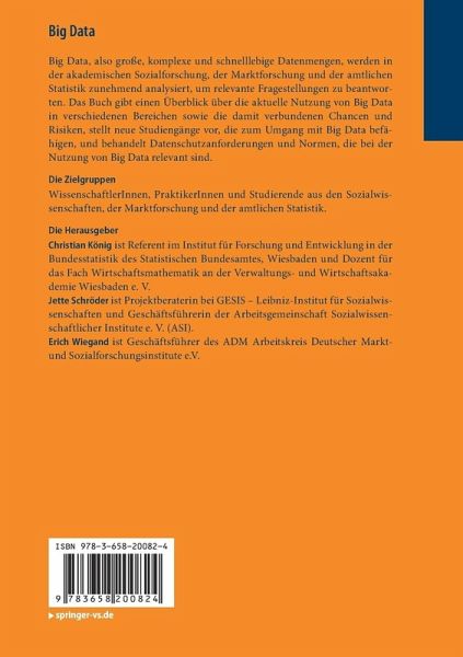 Das Buch gibt einen Überblick über die aktuelle Nutzung von Big Data in verschiedenen Bereichen sowie die damit verbundenen Chancen und Risiken, stellt neue Studiengänge vor, die zum Umgang mit Big Data befähigen, und behandelt Datenschutzanforderungen und Normen, die bei der Nutzung von Big Data relevant sind. Big Data, also große, komplexe und schnelllebige Datenmengen, werden in der akademischen Sozialforschung, der Marktforschung und der amtlichen Statistik zunehmend analysiert, um relevante Fragestellungen zu beantworten.