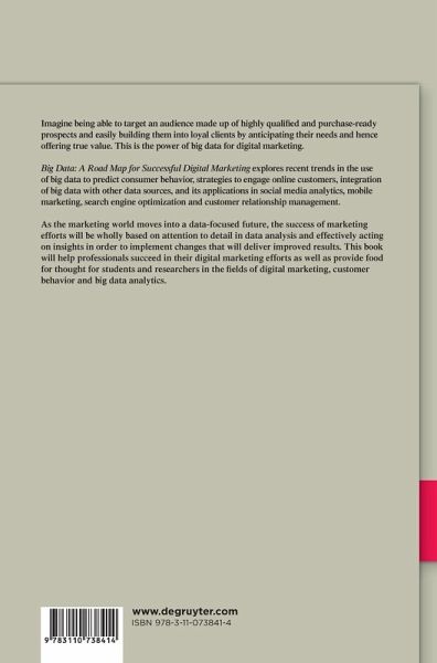 Big Data: A Roadmap for Successful Digital Marketing explores recent trends in the use of big data to predict consumer behavior, strategies to engage online customers, integration of big data with other data sources, and its applications in social media analytics, mobile marketing, search engine optimization and customer relationship management.
