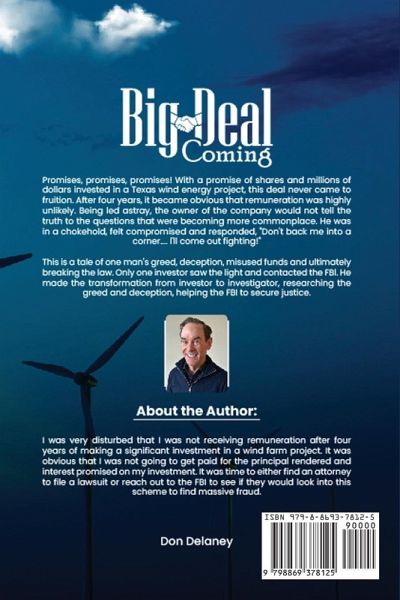 From arid west Texas, the rest of the continental United States, including the forests of Canada, plus the Alps in Western Europe investors were enticed in a wind farm project that was created by a man that seemed to have a legitimate plan. After four years of making a large investment along with many other investors, it was learned that the consultants hired by the lead man were not being paid to help build the project properly. Consequently, lawsuits were filed. It did not take very long that his reputation was in tatters. He couldn't sell the leased property in west Texas for what he thought was reasonable and ultimately he ran out of money. Rather than sue him by hiring an attorney, a letter to the FBI was written and along with it, a large paper trail of documents was sent, showing fraud and false promises of remuneration. This true story developed into a criminal case in the nexus of three government agencies to find a sliver of justice. Delaney was the only person of the hundred investors who decided to contact the FBl. He spent almost six years corresponding with the FBI and Department of Justice to reach the pinnacle of truth and justice. Getting to that point involved many twists and turns with much stress and incredible doubt. It was a wild ride!