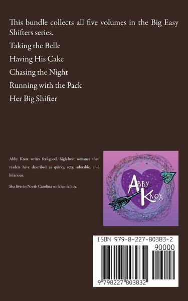 This bundle collects all five volumes in the Big Easy Shifters series. Book one -- Taking the Belle Rosemary has got it all, except any desire for the kind of man her rich daddy approves of. Ashton is the breed of guy who mates for life. He doesn't care who Rosemary's daddy is, and does not care how many gilded hoops he has to jump through. He's gonna marry that girl and do whatever she says to get her down the aisle. Book two -- Having His Cake Celebrity chef Vann has everything from superhero good looks to a fangirl in every port. But now, he's only got eyes for one female, and a powerful need for some Big Easy comfort food. GiGi is a pastry chef with big dreams and a tiny secret. She's got no time for golden boys, but always time to feed a hungry wolf that comes calling. When they meet as humans, it might be more than just a party on the taste buds. There might even be a little blood. Most definitely, there will be icing. Strange things happen when the beasts are hungry. Book three -- Chasing the Night Chastity was on the prowl at her cousin's bachelorette party, determined to finally lose her virginity. Mission accomplished, probably, but she doesn't remember much about the main event. Now, on the hunt for coffee and carbs, the de-flowered debutante's walk of shame has her missing her mystery man at every turn. Gavin wakes up naked and alone in the woods, with vague clues and fuzzy memories of the one-night stand that unfolded after his best friend's bachelor party. But this wolf does not do one-night stands. He's determined to find this perfect woman who rocked his world, and claim her for his own. Book four -- Running with the Pack Bobby has spent most of his life trying to control the beast, and feels his best friend Penn deserves something more than a life tied to a wolf shifter who can't restrain his urge to hunt and kill. Penn has been in love with her best friend Bobby her entire life. What will it take to convince him that she loves the beast inside? Book five -- Her Big Shifter A love story told in found letters... The patriarch of the most powerful shifter clan in New Orleans has a secret, all contained in a pretty, pink box hidden away in the closet. When Lionel and Betsy's daughter uncovers their hushed-up origins of how her parents met, the reading is intriguing, scandalous and heart-pounding stuff. What's more, Rosemary discovers much about why her father behaves the way he does...the source of all of Rosemary and Ash's wedding drama.