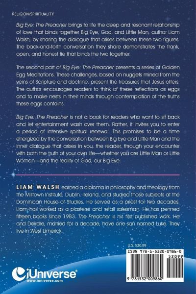 Big Eye: The Preacher brings to life the deep and resonant relationship of love that binds together Big Eye, God, and Little Man, author Liam Walsh, by sharing the dialogue that arises between these two figures. The back-and-forth conversation they share demonstrates the frank, open, and honest tie that binds the two together. The second part of Big Eye: The Preacher presents a series of Golden Egg Meditations. These challenges, based on nuggets mined from the veins of Scripture and doctrine, present the treasures that Jesus offers. The author encourages readers to think of these reflections as eggs and to make nests in their minds through contemplation of the truths these eggs contains. Big Eye: The Preacher is not a book for readers who want to sit back and let entertainment wash over them. Rather, it invites you to enter a period of intensive spiritual renewal. This promises to be a time energized by the conversation between Big Eye and Little Man and the inner dialogue that arises in you, the reader, through your encounter with both the truth of your own life—whether you are Little Man or Little Woman—and the reality of God, our Big Eye.