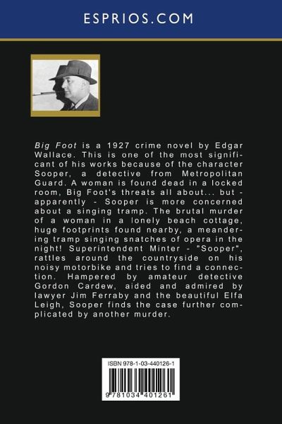 Big Foot is a 1927 crime novel by Edgar Wallace. This is one of the most significant of his works because of the character Sooper, a detective from Metropolitan Guard. A woman is found dead in a locked room, Big Foot's threats all about, but - apparently - Sooper is more concerned about a singing tramp. The brutal murder of a woman in a lonely beach cottage, huge footprints found nearby, a meandering tramp singing snatches of opera in the night! Superintendent Minter - "Sooper", rattles around the countryside on his noisy motorbike and tries to find a connection. Hampered by amateur detective Gordon Cardew, aided and admired by lawyer Jim Ferraby and the beautiful Elfa Leigh, Sooper finds the case further complicated by another murder.