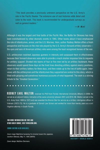 Although it was the largest and final battle of the Pacific War, the Battle for Okinawa has long been overshadowed by other dramatic events in 1945. The books that have been written about it emphasize the role of infantrymen, armor, and U.S. Marines. This work takes a fresh perspective and focuses on the vital role played by the U.S. Army's forward artillery observers-the eyes and ears of American artillery who were among the least recognized heroes of the war. According to Rodney Earl Walton, U.S. artillerymen matched Japanese gunners in intensity and surpassed them in effectiveness because their forward observers were able to provide a much shorter response time to requests for artillery support. Divided into teams consisting of four or five men led by an artillery lieutenant, these observers would spend three days on the front lines directing artillery against enemy positions, return to their artillery battery for three days, and then rotate up to the line of battle again. While trying to maximize the damage inflicted on the enemy, the men had to deal with the ever-present possibility of firing on their own forces. The ability to shift artillery fire throughout the battlefield was a new development in World War II, and its evolution is fully examined in the book. Walton, the son of one of the forward observers on Okinawa, spent more than twenty years investigating what happened to his father and other artillerymen during the conflict. Interviews with the artillerymen and the infantrymen they supported are central to his story, which is filled with gripping and sometimes humorous accounts of what happened. The work stands as a stirring tribute from the "baby boom generation" to the "greatest generation.