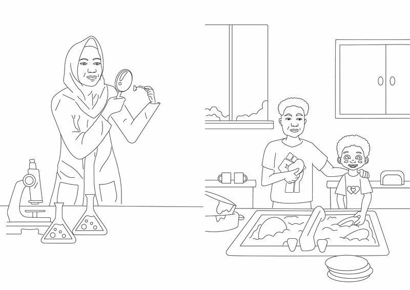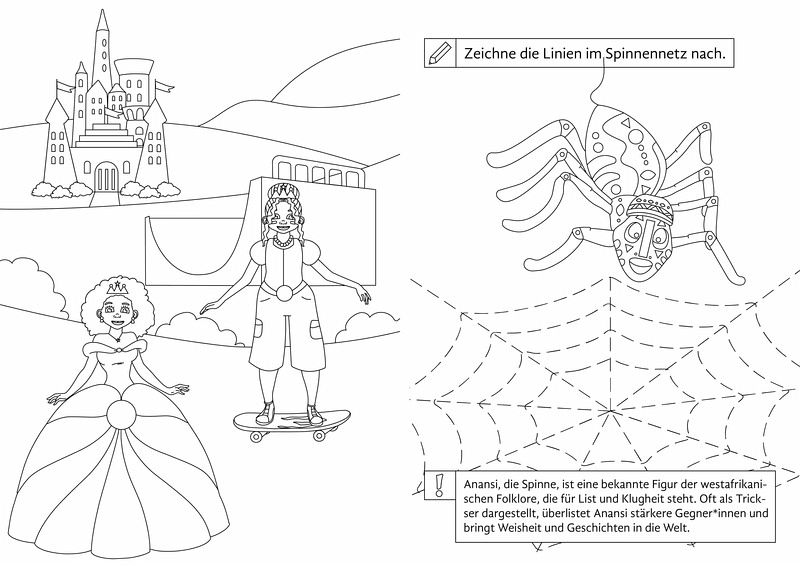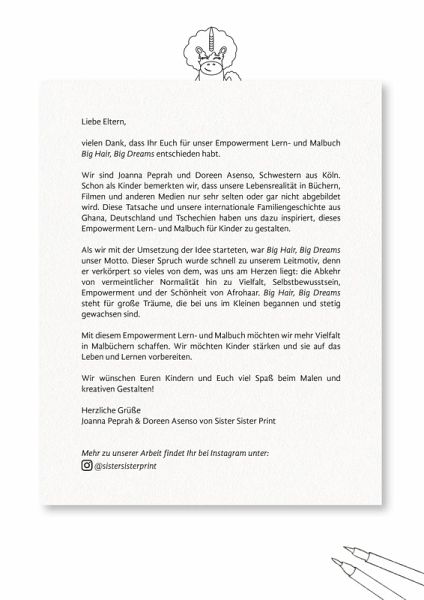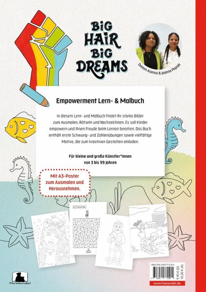 Dieses Empowerment Lern- und Malbuch feiert, was in vielen Malbüchern bisher gefehlt hat: Vielfalt und die Schönheit von Afrohaar! Kinder können unterschiedliche Frisuren kennenlernen und eigene Frisuren auf dem Papier kreieren, unterschiedliche Haarstrukturen werden mit Schwungübungen für Vorschulkinder kombiniert und natürlich gibt es viele wunderschöne Bilder zum Ausmalen: von der Polizistin mit Afro über die Wissenschaftlerin mit Hijab, bis zur Prinzessin, die Skateboard fährt! Unter dem Motto Big Hair, Big Dreams präsentiert das liebevoll gestaltete Lern- und Malbuch starke Bilder zum Ausmalen, Rätseln und Nachzeichnen. Es soll insbesondere Schwarze Kinder und Children of Colour empowern und allen Kindern Freude beim Malen und Lernen bereiten. Das Buch enthält erste Schwung- und Zahlenübungen sowie vielfältige Motive, die zum kreativen Gestalten einladen. Kreiert wurde das Empowerment Lern- und Malbuch von Joanna Peprah und Doreen Asenso, Schwestern aus Köln, mit einer internationalen Familiengeschichte aus Ghana, Deutschland und Tschechien. Schon als Kinder bemerkten sie, dass ihre Lebensrealität in Büchern, Filmen und anderen Medien nur sehr selten oder gar nicht abgebildet wird. Dies inspirierte sie dazu, dieses Empowerment Lern- und Malbuch für Kinder zu gestalten. Und so findet man im Malbuch auch unterschiedliche Motive aus der westafrikanischen Geschichte, die noch heute bei Kindern Kreativität und Fantasie wecken.