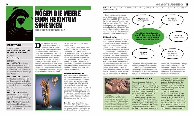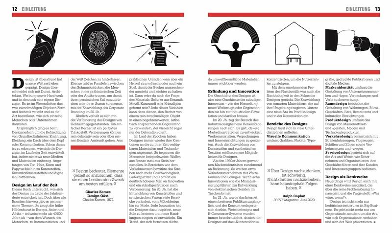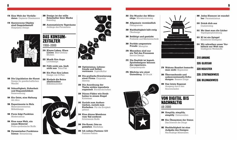 Von frühen Keramiken bis zum Internet der Dinge, von Bauhaus bis Ford Modell T: Auf eine kurze Einführung in Design und Entwurf folgen die wichtigsten Ideen, Innovationen und Durchbrüche in chronologischer Reihenfolge. Zitate und Biografie-Kästen liefern Informationen zu den Macher_innen hinter den Ideen.