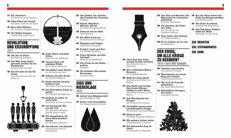 - Die Geschichte des Ersten Weltkrieges in sieben großen Kapiteln: Das Vorspiel zum Konflikt (1870-1914), Kriegsbeginn (1914), Pattsituation (1915), Totaler Krieg (1916), Revolution und Erschöpfung (1917), Sieg und Niederlage (1918), Ein Krieg, der alle Kriege beenden soll? (1919-1923)