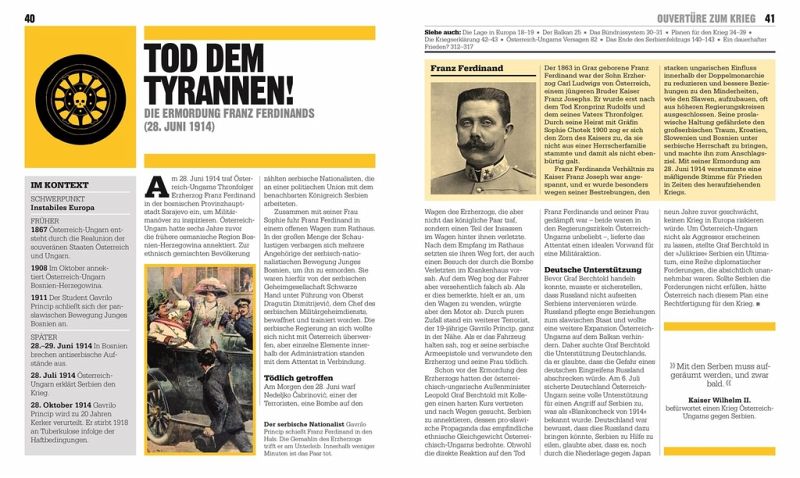 - Über 90 Schlüsselereignisse des ersten globalen Krieges: von den wachsenden Spannungen in Europa und dem Attentat auf Erzherzog Franz Ferdinand über die deutsche Invasion in Belgien, den amerikanischen Kriegseintritt und die russische Revolution bis zum Waffenstillstand und der Gründung des Völkerbundes
