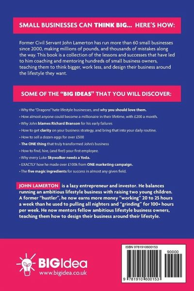 DO YOU STRUGGLE WITH YOUR WORK/LIFE BALANCE? Do you like the idea of running a lifestyle business, rather than putting in 15-hour days, day-after-day? If so, then this is the book for you. John Lamerton used to work 100+ hours a week, as he strived to become the next Alan Sugar or Richard Branson. Then he had kids, and everything changed - he now works part time, 20 to 25 hours per week as a self-styled "lazy entrepreneur". If you want to grow your small business, without having to learn complex marketing strategies, and without being told to simply "work harder than everyone else", then "Big Ideas... for Small Businesses" could be the "lightbulb moment" you've been waiting for... This book is a collection of the lessons, failures and successes that John now uses to coach and mentor hundreds of small business owners, teaching them to think bigger, work less, and design their business around the lifestyle they want. SOME OF THE "BIG IDEAS" THAT YOU WILL DISCOVER: -Why the "Dragons" hate lifestyle businesses, and why you should love them - How almost anyone could become a millionaire in their lifetime, given just £200 a month. - Why John blames Richard Branson for his early failures - How to get clarity on your business strategy, and bring that into your daily routine. - How to sell a dozen eggs for over £500 - The ONE thing that truly transformed John's business - How to find, hire, (and fire!) your first employee. - Why every Luke Skywalker needs a Yoda. - EXACTLY how he made over £100k from ONE marketing campaign. - The five magic ingredients for success in almost any given field. JOHN LAMERTON is a lazy entrepreneur and investor. He mentors fellow ambitious lifestyle business owners, teaching them how to design their business around their lifestyle. He's the co-host of the Ambitious Lifestyle Business podcast, and a regular on BBC Radio. John is a down to earth businessman who is candid about the mistakes he made and why he believes he made them.Buy this book if you want to have a lifestyle business that gives you a better work/life balance...