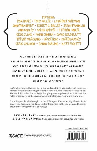 Foreword - David Edmonds & Nigel Warburton SECTION ONE: FIELDS OF ENQUIRY Rom Harré on What is Social Science - Rom Harré Toby Miller on Cultural Studies - Toby Miller Lawrence Sherman on Criminology - Lawrence Sherman Jonathan Haidt on Moral Psychology - Jonathan Haidt Robert J. Shiller on Behavioural Economics - Robert J. Shiller SECTION TWO: BIRTHS, DEATHS & HUMAN POPULATION Sarah Franklin on the Sociology of Reproductive Technology - Sarah Franklin Ann Oakley on Women's Experience of Childbirth - Ann Oakley Sarah Harper on the Population Challenge for the 21st Century - Sarah Harper Stephen Pinker on Violence and Human Nature - Stephen Pinker SECTION THREE: SOCIAL SCIENCE THROUGH DIFFERENT LENSES Greg Clark on Names - Greg Clark Robin Dunbar on Dunbar Numbers - Robin Dunbar David Goldblatt on the Sociology of Football - David Goldblatt Trevor Marchand on Craft - Trevor Marchand Bruce Hood on the Supernatural - Bruce Hood Doreen Massey on Space - Doreen Massey SECTION FOUR: POLITICS AND SOCIAL SCIENCE Craig Calhoun on Protest Movements - Craig Calhoun Danny Dorling on Inequality - Danny Dorling Kate Pickett on the Case for Equality - Kate Pickett