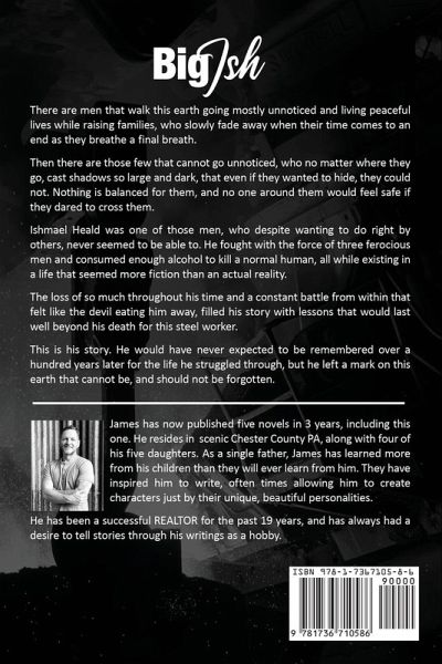 Big Ish There are men that walk this earth going mostly unnoticed and living peaceful lives while raising families, who slowly fade away when their time comes to an end as they breathe a final breath. Then there are those few that cannot go unnoticed, who no matter where they go, cast shadows so large and dark, that even if they wanted to hide, they could not. Nothing is balanced for them, and no one around them would feel safe if they dared to cross them. Ishmael Heald was one of those men, who despite wanting to do right by others, never seemed to be able to. He fought with the force of three ferocious men and consumed enough alcohol to kill a normal human, all while existing in a life that seemed more fiction than an actual reality. The loss of so much throughout his time and a constant battle from within that felt like the devil eating him away, filled his story with lessons that would last well beyond his death for this steel worker.