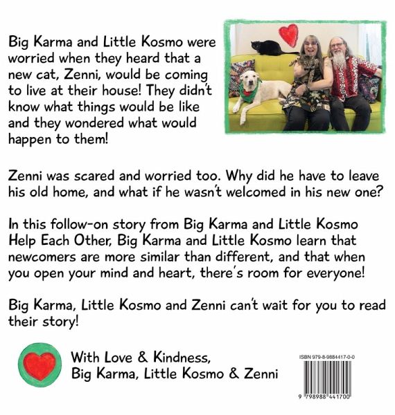 Big Karma and Little Kosmo are worried when they hear that a new cat, Zenni will be coming to live with them. What if the newcomer steals their food and takes their toys? What if the pet parents love New Cat Zenni more? In this follow-on story to Big Karma and Little Kosmo Help Each Other, you'll find out how Big Karma and Little Kosmo learn that newcomers are more similar than different and that when you open your mind, your heart and your home, you'll find that there is room for everyone, and enough to go around! Answer the Questions to Explore at the end of the story, and you'll be all set to welcome newcomers with kindness too!