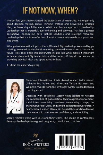 The last few years have changed the expectation of leadership. No longer only about decision making, critical thinking, crafting and delivering a strategic plan, but becoming a fuller, more holistic, and human approach to leadership. Leadership that is impactful, ever enhancing and evolving. That has a greater perspective, considering both tactical solutions and strategic relevance. Leadership that is a true reflection of what a community needs to support and lead them. What got us here will not get us there. We need Big Leadership. We need bigger thinking. We need bolder decision making. We need brave action to create the future. This book offers straightforward insight into what makes it important for leaders to adopt Big Leadership, and the impacts if they do not. As well as providing practical ideas and approaches for how. It is time for leaders to go big. Nine-time International Stevie Award winner, twice named LinkedIn Top Voice, and nine-time Telstra Business and Women's Awards Nominee, Dr Stacey Ashley is a leadership & coaching expert. Obsessed with possibility, Stacey helps leaders to navigate the complexities of globalisation, technological advancement, social interconnectivity, massively accelerating change, the changing world of work, and a multi-generational workforce. A heart-centred leader, Stacey has helped thousands to develop their leadership competence, confidence, and credibility. Stacey typically works with CEOs and their teams. She speaks at conferences, develops leadership strategy and programs, consults, and coaches.