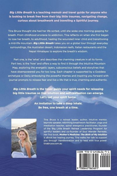 Big Little Breath is a teaching memoir and travel guide for anyone who is looking to break free from their big little traumas, navigating change, curious about breathwork and travelling a Spiritful journey. Tina Bruce thought she had her life sorted, until she woke one morning gasping for breath. From childhood anorexia to addiction, Tina reflects on when she first began to lose her breath, to adulthood, healing the wounded inner child and transitioning a mid-life mountain. Big Little Breath takes you on a global tour through everyday surroundings, the Australian desert, Indonesian reefs, Italian restaurants and the Nepal Himalayas to explore the breath's wisdom. Part one, is the 'what' and describes the charming creature in all its forms. Part two, is the 'how' and offers a way to find it through the Intuitive Mountain Map, exploring the energetic layers, subconscious beliefs and storylines that have disempowered you for too long. Each chapter is supported by a Goddess archetype or Deity embodying the powerful themes and inspiring you forward with journal prompts to release fear and live a life that is true, charming and authentic. Big Little Breath is the travel guide your spirit needs for releasing big little traumas so that intuition and self-realisation can emerge. Let's call your spirit home.An invitation to take a deep inhale.Be free, one breath at a time.