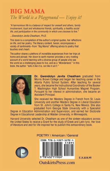 Big Mama The World is a Playground - Enjoy it! "A harmonious life is a balance of respect for oneself and others, family involvement, loyal and wholesome friends, spirituality, a healthy social life, and participation in the community in which one chooses to live." -Gwendolyn Jevita Cheatham, Ph.D. This book is a compilation of the author's original quotes, her reflections on life, and her poetry. The literary content, herein, encompasses a variety of sentiments--from "Big Mama" offering advice to poetry that touches one's heart. The author shares a plethora of incredible experiences from her trips at home and abroad. Her down to earth manner provides a very riveting account of a world teeming with a diverse group of people who see the world as a challenging place to live, and as a "Wonderland." In this book, the author "tells it like it is, not like it ain't."