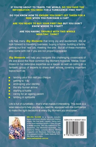 IF YOU'RE ABOUT TO TRAVEL THE WORLD, DO YOU HAVE THE INFORMATION YOU NEED FOR A TURBULENCE-FREE TRIP? DO YOU KNOW HOW TO ENSURE YOU DON'T GET TAKEN FOR A RIDE WHEN YOU PURCHASE A CAR? ARE YOU READY TO BUY YOUR FIRST PAD BUT YOU DON'T KNOW WHERE TO START? ARE YOU HAVING TROUBLE WITH THIS WHOLE 'ADULTING' THING? Life has many Big Moments that bring joy and excitement. We all look forward to travelling overseas, buying a home, building a family, getting our first 'real' job, meeting 'the one'. But all of these moments also come with risk if you are not properly prepared. Big Moments will help you navigate the challenging crossroads of life and avoid the most common Big Moment mistakes. Melisa Sloan draws on her extensive expertise as a lawyer as well as calling on a fantastic group of experts to share their advice, covering important topics such as: landing your first real pay cheque getting to 'I do' embracing your identity the tiny human arrival starting a hustle caring for an ageing parent landing in splitsville Life is full of curveballs - that's what makes it interesting. This book is a wise resource to help you live you best life, equipped with the confidence to make the right decisions at every Big Moment you encounter.