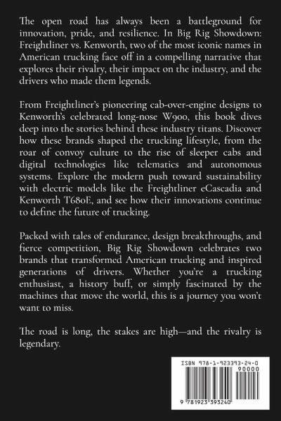 The open road has always been a battleground for innovation, pride, and resilience. In Big Rig Showdown: Freightliner vs. Kenworth, two of the most iconic names in American trucking face off in a compelling narrative that explores their rivalry, their impact on the industry, and the drivers who made them legends. From Freightliner's pioneering cab-over-engine designs to Kenworth's celebrated long-nose W900, this book dives deep into the stories behind these industry titans. Discover how these brands shaped the trucking lifestyle, from the roar of convoy culture to the rise of sleeper cabs and digital technologies like telematics and autonomous systems. Explore the modern push toward sustainability with electric models like the Freightliner eCascadia and Kenworth T680E, and see how their innovations continue to define the future of trucking. Packed with tales of endurance, design breakthroughs, and fierce competition, Big Rig Showdown celebrates two brands that transformed American trucking and inspired generations of drivers. Whether you're a trucking enthusiast, a history buff, or simply fascinated by the machines that move the world, this is a journey you won't want to miss. The road is long, the stakes are high-and the rivalry is legendary.