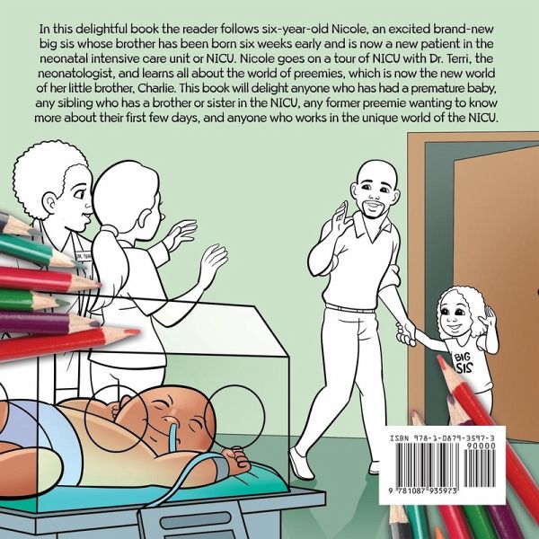 In this delightful coloring book the reader follows six-year-old Nicole, an excited brand-new big sis whose brother has been born six weeks early and is now a new patient in the neonatal intensive care unit or NICU. Nicole goes on a tour of NICU with Dr. Terri, the neonatologist, and learns all about the world of preemies, which is now the new world of her little brother, Charlie. This book will delight anyone who has had a premature baby, any sibling who has a brother or sister in the NICU, any former preemie wanting to know more about their first few days, and anyone who works in the unique world of the NICU.