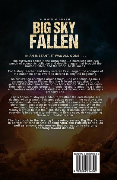 In an instant, it was all gone. The survivors called it the Unraveling-a merciless one-two punch of economic collapse and deadly plague that brought the United States, and the world, to its knees. For history teacher and Army veteran Eric Jaeger, the collapse of the nation he once swore to defend is only the beginning. As civilization crumbles around them, Eric and tough-as-nails paramedic Susan Walker flee the Milwaukee suburbs for the safety of the Montana home of his Army buddy, Manny Landeros. They join an eclectic group of friends forced to adapt to a violent and lawless world in which kindness and decency end at Manny's property line. Eric's hopes of staying hidden to weather the catastrophe are dashed when a wealthy despot seizes power in the nearby state capital and hatches a horrific plan with the remnants of a federal government desperate to regain control at any cost. When the enigmatic leader of a growing resistance movement asks Manny's group to join the fight, they must decide whether to risk everything to defeat a tyrant-and in Eric's case, risk sacrificing Susan on freedom's altar. The first book in the riveting Unraveling series, Big Sky Fallen is perfect for fans of One Second After, the Patriots series, as well as anyone who worries that our nation is charging headlong toward disaster.