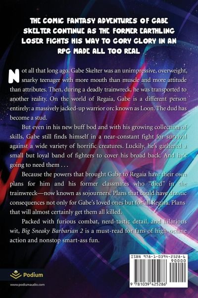 The comic fantasy adventures of Gabe Skelter continue as the former Earthling loser fights his way to gory glory in an RPG made all too real. Not all that long ago, Gabe Skelter was an unimpressive, overweight, snarky teenager with more mouth than muscle and more attitude than attributes. Then, during a deadly trainwreck, he was transported to another reality. On the world of Regaia, Gabe is a different person entirely: a massively jacked-up warrior orc known as Loon. The dud has become a stud. But even in his new buff bod and with his growing collection of skills, Gabe still finds himself in a near-constant fight for survival against a wide variety of horrific creatures. Luckily, he's gathered a small but loyal band of fighters to cover his broad back. And he's going to need them . . . Because the powers that brought Gabe to Regaia have their own plans for him and his former classmates who ?died? in the trainwreck?now known as sojourners. Plans that could have drastic consequences not only for Gabe's loved ones but for all Regaia. Plans that will almost certainly get them all killed. Packed with furious combat, nerd-tastic detail, and hilarious wit, Big Sneaky Barbarian 2 is a must-read for fans of high-octane action and nonstop smart-ass fun. ?Wow . . . you didn't even ask me for a blurb. Well, you can just go screw yourself, Mr. Seth.? ?Matt Dinniman, bass player (also, I guess, author of Dungeon Crawler Carl)