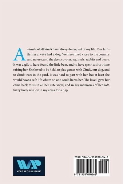 Animals of all kinds have always been part of my life. Our family has always had a dog. We have lived close to the country and nature, and the deer, coyotes, squirrels, rabbits and bears. It was a gift to have found the little bear, and to have spent a short time raising her. She loved to be held, to play games with Cindy, our dog, and to climb trees in the yard. It was hard to part with her, but at least she would have a safe life where no one could harm her. The love I gave her came back to us in all her cute ways, and in my memories of her soft, fuzzy body nestled in my arms for a nap.