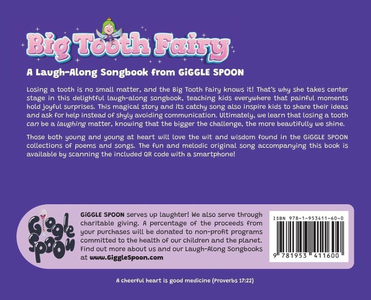 BIG TOOTH FAIRY A Laugh-Along Songbook Losing a tooth is no small matter, and the Big Tooth Fairy knows it! That's why she takes center stage in this delightful laugh-along songbook, teaching kids everywhere that painful moments hold joyful surprises. This magical story and its catchy song also inspire kids to share their ideas and ask for help instead of shyly avoiding communication. Ultimately, we learn that losing a tooth can be a laughing matter, knowing that the bigger the challenge, the more beautifully we shine. Those both young and young at heart will love the wit and wisdom found in the GiGGLE SPOON collections of poems and songs. The fun and melodic original song accompanying this book is available by scanning the included QR code with a smartphone! GiGGLE SPOON serves up laughter! We also serve through charitable giving. A percentage of the proceeds from your purchases will be donated to non-profit programs committed to the health of our children and the planet. Find out more about us and our Laugh-Along Songbooks at www.GiggleSpoon.com A cheerful heart is good medicine (Proverbs 17:22)