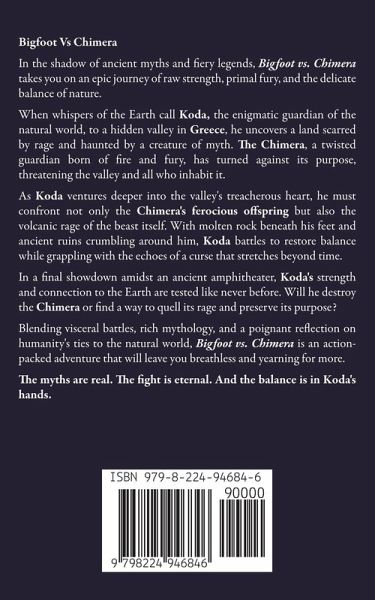Bigfoot Vs Chimera In the shadow of ancient myths and fiery legends, Bigfoot vs. Chimera takes you on an epic journey of raw strength, primal fury, and the delicate balance of nature. When whispers of the Earth call Koda, the enigmatic guardian of the natural world, to a hidden valley in Greece, he uncovers a land scarred by rage and haunted by a creature of myth. The Chimera, a twisted guardian born of fire and fury, has turned against its purpose, threatening the valley and all who inhabit it. As Koda ventures deeper into the valley's treacherous heart, he must confront not only the Chimera's ferocious offspring but also the volcanic rage of the beast itself. With molten rock beneath his feet and ancient ruins crumbling around him, Koda battles to restore balance while grappling with the echoes of a curse that stretches beyond time. In a final showdown amidst an ancient amphitheater, Koda's strength and connection to the Earth are tested like never before. Will he destroy the Chimera or find a way to quell its rage and preserve its purpose? Blending visceral battles, rich mythology, and a poignant reflection on humanity's ties to the natural world, Bigfoot vs. Chimera is an action-packed adventure that will leave you breathless and yearning for more. The myths are real. The fight is eternal. And the balance is in Koda's hands.