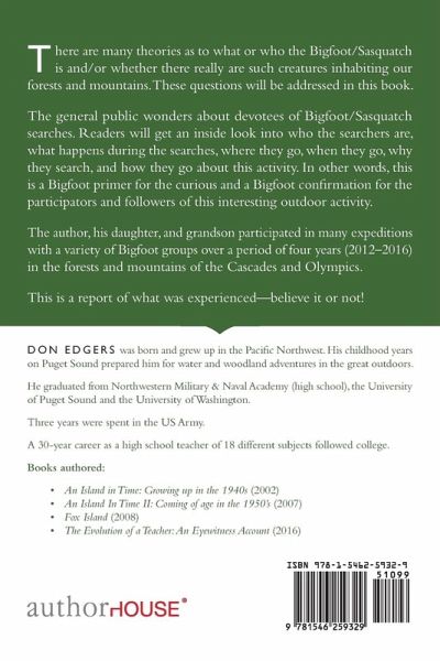 There are many theories as to what or who the Bigfoot/Sasquatch is and/or whether there really are such creatures inhabiting our forests and mountains. These questions will be addressed in this book. The general public wonders about devotees of Bigfoot/Sasquatch searches. Readers will get an inside look into who the searchers are, what happens during the searches, where they go, when they go, why they search, and how they go about this activity. In other words, this is a Bigfoot primer for the curious and a Bigfoot confirmation for the participators and followers of this interesting outdoor activity. The author, his daughter, and grandson participated in many expeditions with a variety of Bigfoot groups over a period of four years (20122016) in the forests and mountains of the Cascades and Olympics. This is a report of what was experiencedbelieve it or not!