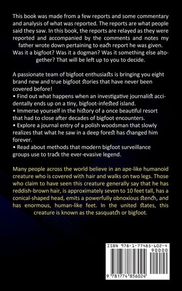 This book was made from a few reports and some commentary and analysis of what was reported. The reports are what people said they saw. In this book, the reports are relayed as they were reported and accompanied by the comments and notes my father wrote down pertaining to each report he was given. Was it a bigfoot? Was it a dogman? Was it something else altogether? That will be left up to you to decide. A passionate team of bigfoot enthusiasts is bringing you eight brand new and true bigfoot stories that have never been covered before!Find out what happens when an investigative journalist accidentally ends up on a tiny, bigfoot-infested island. Immerse yourself in the history of a once beautiful resort that had to close after decades of bigfoot encounters. Explore a journal entry of a polish woodsman that slowly realizes that what he saw in a deep forest has changed him forever. Read about methods that modern bigfoot surveillance groups use to track the ever-evasive legend. Many people across the world believe in an ape-like humanoid creature who is covered with hair and walks on two legs. Those who claim to have seen this creature generally say that he has reddish-brown hair, is approximately seven to 10 feet tall, has a conical-shaped head, emits a powerfully obnoxious stench, and has enormous, human-like feet. In the united states, this creature is known as the sasquatch or bigfoot.