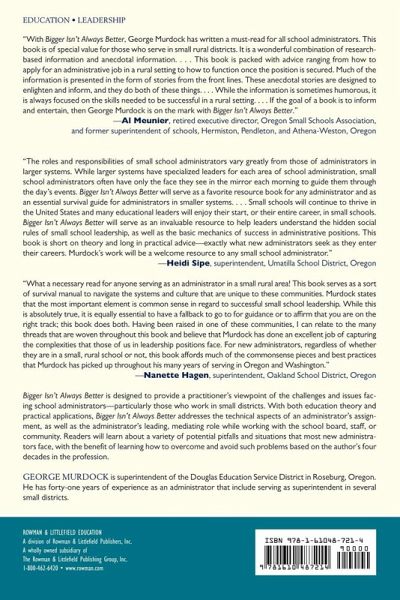 Bigger Isn't Always Better is designed to provide a practitioner's viewpoint of the challenges and issues facing school administrators - particularly those who work in small districts. Based upon a combination of education theory and practical applications, the book contains many real life exampleswith tips for landing a job as administrator and then making a positive and successful first impression through a deliberate entry plan. Bigger Isn't Always Better addresses both the technical aspects of an administrator's assignment, as well as the administrator's leading, mediating role while working with the school board, with school staff, or the school's community. Readers will learn about a variety of potential pitfalls and situations that most new administrators face, with the benefit of learning how to over come and avoid such problems based on the author's four decades in the profession.