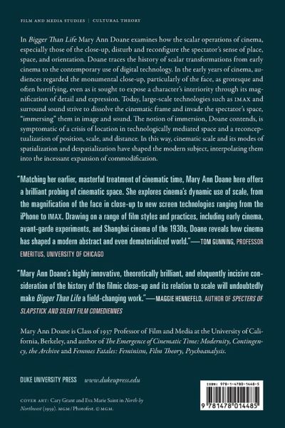 In Bigger Than Life Mary Ann Doane examines how the scalar operations of cinema, especially those of the close-up, disturb and reconfigure the spectator's sense of place, space, and orientation. Doane traces the history of scalar transformations from early cinema to the contemporary use of digital technology. In the early years of cinema, audiences regarded the monumental close-up, particularly of the face, as grotesque and often horrifying, even as it sought to expose a character's interiority through its magnification of detail and expression. Today, large-scale technologies such as IMAX and surround sound strive to dissolve the cinematic frame and invade the spectator's space, "immersing" them in image and sound. The notion of immersion, Doane contends, is symptomatic of a crisis of location in technologically mediated space and a reconceptualization of position, scale, and distance. In this way, cinematic scale and its modes of spatialization and despatialization have shaped the modern subject, interpolating them into the incessant expansion of commodification.