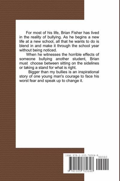 Brian Fisher is an ordinary student that just wants to make it through the school year without incident. He is well on his way to accomplishing his goal until he bears witness to how much bullying can destroy someone. With pain in his heart, Brian must face his biggest fear with the help of some new found friends. Together they will learn to be bigger than their bullies