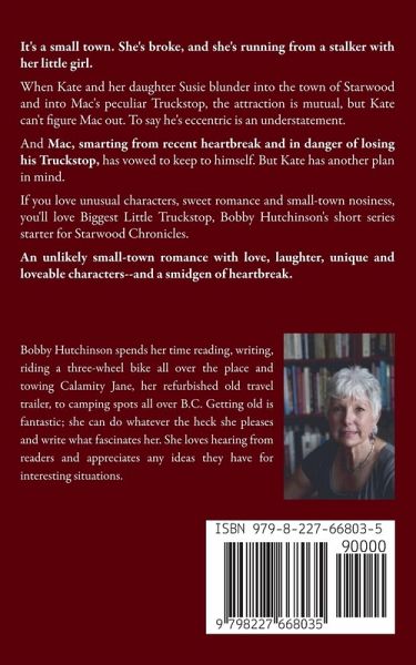 It's a small town. She's broke, and she's running from a stalker with her little girl. When Kate and her daughter Susie blunder into the town of Starwood and into Mac's peculiar Truckstop, the attraction is mutual, but Kate can't figure Mac out. To say he's eccentric is an understatement. And Mac, smarting from recent heartbreak and in danger of losing his Truckstop, has vowed to keep to himself. But Kate has another plan in mind. If you love unusual characters, sweet romance and small-town nosiness, you'll love Biggest Little Truckstop, Bobby Hutchinson's short series starter for Starwood Chronicles. An unlikely small-town romance with love, laughter, unique and loveable characters--and a smidgen of heartbreak.