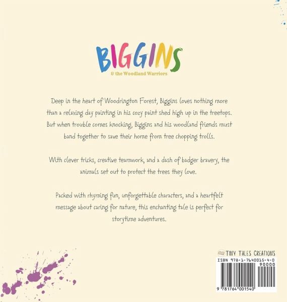 Biggins is a badger who loves the quiet life, spending his days painting in his cozy treehouse studio, high in the treetops. He enjoys the peaceful sounds of the forest-the rustling leaves, the chirping birds, and the gentle breeze that carries the scent of pine. But one day, that peace is shattered when a band of troublesome tree trolls arrives, ready to chop down the trees and destroy the home he loves. At first, Biggins isn't sure what to do. He's just a painter, not a warrior! But he soon realizes that he doesn't have to face the trolls alone. With the help of his clever woodland friends-including a swift squirrel, a cunning fox, and a wise old owl-they hatch a creative plan to outsmart the trolls. Using their wits, teamwork, and a few unexpected surprises, they send the tree-chopping troublemakers running for good! Told in playful rhyme and paired with stunning illustrations, Biggins and the Woodland Warriors is a heartwarming tale of courage, creativity, and friendship. Perfect for children ages 4-8, this charming story inspires a love for nature and proves that even the smallest creatures can make a big difference.