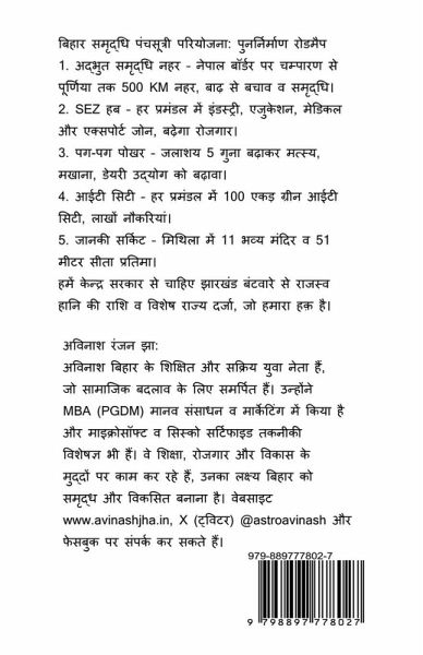 Bihar Revival: A Roadmap From Glorious Past to Prosperous Future Why is Bihar, the land of Nalanda, Ashoka and Buddha, grappling with deep-rooted crises like devastating floods, mass migration, crippling unemployment and systemic corruption? Activist-politician and thinker Avinash Ranjan Jha presents a hard-hitting, in-depth and data-driven analysis of Bihar's multifaceted problems. But this book offers more than just a diagnosis. It unveils a visionary, integrated, and actionable roadmap for Bihar's complete regeneration (Punarnirman) - the ambitious "Bihar Samriddhi Panchasutri Pariyojana" (5-Point Prosperity Plan). Discover how the revolutionary Adbhut Samriddhi Canal can turn the flood curse into a boon, how SEZs and Satellite IT Cities in every division can create millions of jobs curbing migration, how the 'Pag-Pag Pokhar' scheme can revive the rural economy, and how the Janaki Circuit can restore cultural glory. Integrating technology, data-driven solutions, sustainable development, and the ideals of Gandhi-Lohia-JP, this book paves the way for a new, self-reliant, and prosperous Bihar. Essential reading for policymakers, global Bihari diaspora, investors, students, and anyone interested in India's developmental challenges and innovative solutions. Keywords: Bihar Development, Flood Control, Unemployment Solution, Migration Control, Bihar SEZ, IT City Bihar, Janaki Circuit, Mithila, Avinash Ranjan Jha, Bihar Revival, Sustainable Development, Good Governance.