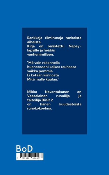 Rankkoja riimirunoja rankoista aiheista. Kirja on omistettu Nepsy-lapsille ja heidän vanhemmilleen. "Mä voin rakennella huoneessani kaikes rauhassa vaikka pommia Ei ketään kiinnosta Mitä mulle kuuluu." Mikko Nevantakanen on Vaasalainen runoilija ja taiteilija.Biisit 2 on hänen kuudestoista runokokoelma.