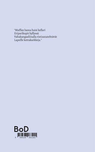 "Muffan luona haisi kellari Eriparikupit hyllyssä Vahakangasliinalla ristisanatehtävät Lapsille kettukarkkeja."