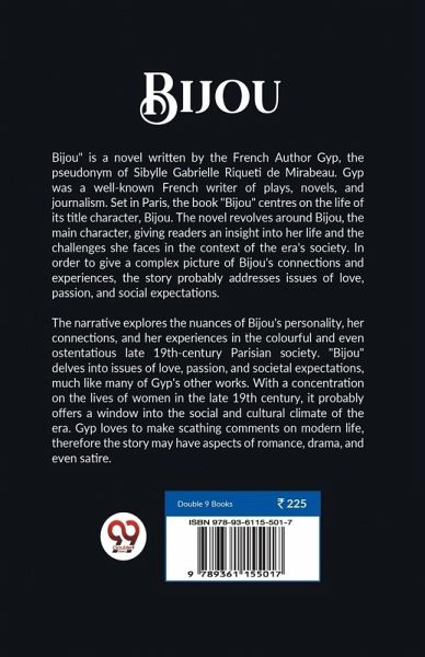 Bijou" is a novel written by the French Author Gyp, the pseudonym of Sibylle Gabrielle Riqueti de Mirabeau. Gyp was a well-known French writer of plays, novels, and journalism. Set in Paris, the book "Bijou" centres on the life of its title character, Bijou. The novel revolves around Bijou, the main character, giving readers an insight into her life and the challenges she faces in the context of the era's society. In order to give a complex picture of Bijou's connections and experiences, the story probably addresses issues of love, passion, and social expectations. The narrative explores the nuances of Bijou's personality, her connections, and her experiences in the colourful and even ostentatious late 19th-century Parisian society. "Bijou" delves into issues of love, passion, and societal expectations, much like many of Gyp's other works. With a concentration on the lives of women in the late 19th century, it probably offers a window into the social and cultural climate of the era. Gyp loves to make scathing comments on modern life, therefore the story may have aspects of romance, drama, and even satire.