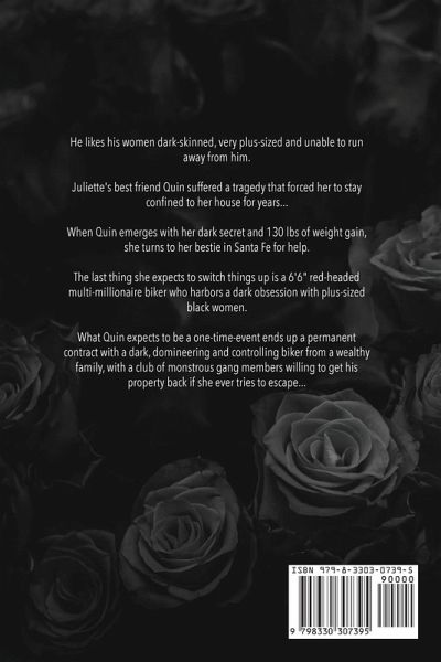 He likes his women dark-skinned, very plus-sized and unable to run away from him. Juliette's best friend Quin suffered a tragedy that forced her to stay confined to her house for years... When Quin emerges with her dark secret and 130 lbs of weight gain, she turns to her bestie in Santa Fe for help. The last thing she expects to switch things up is a 6'6" red-headed multi-millionaire biker who harbors a dark obsession with plus-sized black women. What Quin expects to be a one-time-event ends up a permanent contract with a dark, domineering and controlling biker from a wealthy family, with a club of monstrous gang members willing to get his property back if she ever tries to escape... A dark motorcycle club romance with triggers and a truly plus-sized female lead. This spicy bwwm romance is a heated enemies-to-lovers adventure and third in a series of interconnected standalone small town organized crime stories set in the Midwestern US with a black female lead and a smokin' white alpha. Extremely spicy romance not for the faint hearted.