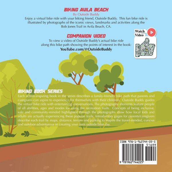 Ignite Adventure with Outside Buddy on the Bob Jones Trail! Adventure Book for Kids Join the energetic and enthusiastic Outside Buddy for an unforgettable bike ride in beautiful Avila Beach! This engaging picture book for kids invites young readers to explore the scenic Bob Jones Trail, from shaded tunnels of trees to secret gardens, playful zig-zag paths, and a beachside playground. Along the way, kids will learn about nature, bike safety, and even life values like friendship, sharing and curiosity. Packed with stunning photographs, fascinating observations about nature, and fun discoveries like hidden waterfalls, friendly ducks, and colorful mosaics, this children's book about sharing inspires curiosity, outdoor adventure and exploration. Discover the Joy of Adventure and Exploring with Family! California Travel Guide for Parents Discover the beauty and wonder of California with outdoor books that are a fun and interactive guide to family-friendly adventures! Perfect for kids and parents alike, this family activities book combines real-life photographs, engaging storytelling, and practical tips to inspire exploration and appreciation for the great outdoors-all wrapped up in an exciting, action-packed day trip. Adventure Challenge for Family In this travel book for kids ages 6-10, join Outside Buddy on a 3-mile bike ride along Avila Beach's scenic Bob Jones Trail, a path filled with fascinating sights that will captivate your family. Scan the thumbs-up QR code to preview Outside Buddy's bike ride on YouTube video, and check out extra content on OutsideBuddyBooks.com, and follow on social media for new rides! You'll KNOW if you want to go! Whether you're planning your own bike trips or just dreaming of adventure, Outside Buddy is here to guide the joys of exploration, learning, and connecting with nature. Family Fun Gifts: What Makes Outside Buddy Books Special? These California adventure books for boys and girls feature:Real photos for kids that capture the beauty of California's landscapes Detailed maps, parking tips, and activity ideas make trip planning a breeze Inspires curiosity, exploration, and an appreciation for God's creation Packed with fun, values-based lessons kids will love Inspires activity for kids outside and shows fun things to do outside Perfect for kids and parents, Biking Avila Beach by Outside Buddy blends exploration with life lessons, making it more than a story-it's an invitation to get outside, connect, and discover nature together. Get ready to pedal, play, and explore with Outside Buddy. You'll laugh, learn, and maybe even find your next outdoor adventure! California Books for Kids Let's ride, explore, and make memories together!