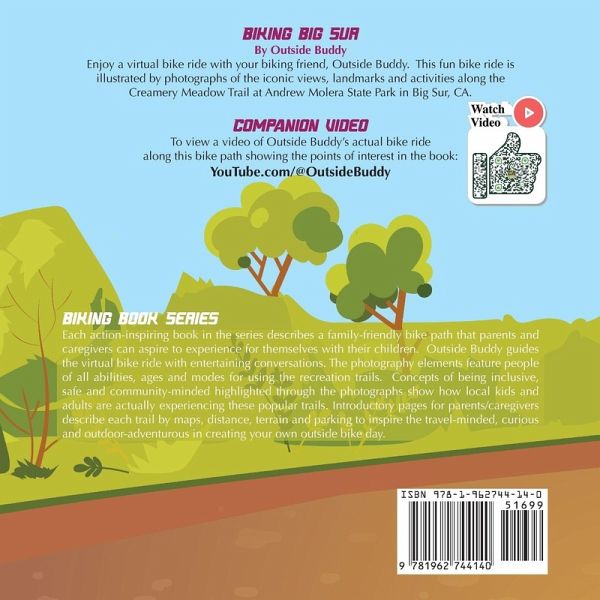 Enjoy a virtual bike ride with your biking friend, Outside Buddy. This fun bike ride is illustrated by photographs of the iconic views, landmarks and activities along the Creamery Meadow Trail at Andrew Molera State Park in Big Sur, CA. Top 5 reasons kids go crazy over Biking Big Sur by Outside Buddy:Real life characters that are inclusive and diverse It's an adventure kids bike ride challenge story that builds confidence Shows a discovery center all about Condors Features park rangers, teaches trail etiquette & leave no trace You discover an active grandma out on the trail & a tipi on the beach Top reasons parents love this book:It's a bucket list family travel book about iconic Big Sur, CA! Parents want exciting books for kids that engage them Families enjoying the travel biking trend & those who love travel kids books All-in-one bike day planning guide & parenting hack for busy moms & dads Visiting or living in California and need a family-friendly activity & travel guide If you like kid's action and adventure books and a bike challenge is something you would like to do with your family, the book has a special QR code inside that will allow you access a fun virtual bike ride preview video! If you're looking for top inspirational books & action adventure books, what are you waiting for? Click the buy button to order your copy of Biking Big Sur by Outside Buddy and see yourself and the kids exploring and biking Big Sur too!