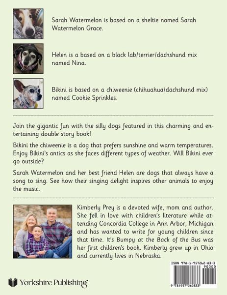 Author Kimberly Prey has written a fun read aloud story for kids of all ages. Beautiful illustrations will capture imaginations and delight children as they join the gigantic fun with the silly dogs featured in the charming and entertaining double story book! Bikini the chiweenie is a dog that prefers sunshine and warm temperatures. Enjoy Bikini's antics as she faces different types of weather. Will bikini EVER go outside? Sarah Watermelon and her best friend Helen are dogs that always have a song to sing. See how their singing delight inspires the other animals to enjoy the music. You just may find yourselves singing along!