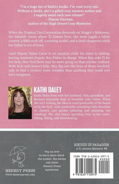 "I’m a huge fan of Kathi’s books. I think I’ve read every one. Without a doubt, she’s a gifted cozy mystery author and I eagerly await each new release!" – Dianne Harman, Author of the High Desert Cozy Mysteries "Daley’s characters come to life on the page. Her novels are filled with a little mystery and a little romance which makes for a murderous adventure." – Tonya Kappes, USA Today Bestselling Author of Fixin’ To Die "Daley’s mysteries offer as much sizzle and pop as fireworks on a hot summer’s day." – Mary Kennedy, Author of The Dream Club Mysteries "Intriguing, likeable characters, keep-you-guessing mysteries, and settings that literally transport you to Paradise…Daley’s stories draw you in and keep you glued until the very last page." – Tracy Weber, Agatha-Nominated Author of the Downward Dog Mysteries "Daley really knows how to write a top-notch cozy." – MJB Reviewers "Kathi Daley writes a story with a puzzling cold-case mystery while highlighting…the love of home, family, and good friends." – Chatting About Cozies When the Tropical Tan Corporation descends on Maggie's Hideaway, the lakeside resort where Tj Jensen lives, she must juggle a bikini contest, a BBQ cook-off, a missing model, and a dead chaperone while her father is out of town. Lead Deputy Dylan Caine is on vacation while his sister is visiting, leaving Assistant Deputy Roy Fisher in charge. When Roy asks Tj for her help, they find there may be more going on than anyone realized. With Kyle and Jenna's help, they dig into the lives of those involved, only to find a mystery more complex than anything they could ever have imagined. Related subjects include: cozy mysteries, women sleuths, murder mystery series, whodunit mysteries (whodunnit), book club recommendations, amateur sleuth books, small town. Books in the Tj Jensen Mystery Series: PUMPKINS IN PARADISE (#1) SNOWMEN IN PARADISE (#2) BIKINIS IN PARADISE (#3) CHRISTMAS IN PARADISE (#4) PUPPIES IN PARADISE (#5) HALLOWEEN IN PARADISE (#6) TREASURE IN PARADISE (#7) April 2017 Part of the Henery Press Mystery Series Collection, if you like one, you'll probably like them all… Author Bio: Kathi Daley lives with her husband, kids, grandkids, and Bernese mountain dogs in beautiful Lake Tahoe. When she isn’t writing, she likes to read (preferably at the beach or by the fire), cook (preferably something with chocolate or cheese), and garden (planting and planning, not weeding). She also enjoys spending time in the water, hiking, biking, and snowshoeing. Kathi uses the mountain setting in which she lives, along with the animals (wild and domestic) that share her home, as inspiration for her five cozy mystery series: Zoe Donovan, Whales and Tails Island, Tj Jensen, Sand and Sea Hawaiian, and Seacliff High Teen.