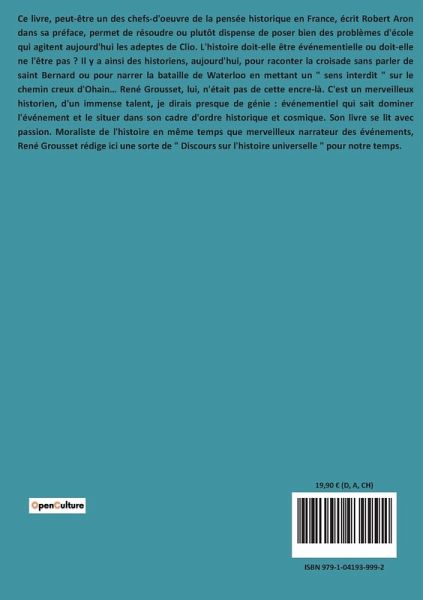 Ce livre, peut-être un des chefs-d'oeuvre de la pensée historique en France, écrit Robert Aron dans sa préface, permet de résoudre ou plutôt dispense de poser bien des problèmes d'école qui agitent aujourd'hui les adeptes de Clio. L'histoire doit-elle être événementielle ou doit-elle ne l'être pas ? Il y a ainsi des historiens, aujourd'hui, pour raconter la croisade sans parler de saint Bernard ou pour narrer la bataille de Waterloo en mettant un " sens interdit " sur le chemin creux d'Ohain¿ René Grousset, lui, n'était pas de cette encre-là. C'est un merveilleux historien, d'un immense talent, je dirais presque de génie : événementiel qui sait dominer l'événement et le situer dans son cadre d'ordre historique et cosmique. Son livre se lit avec passion. Moraliste de l'histoire en même temps que merveilleux narrateur des événements, René Grousset rédige ici une sorte de " Discours sur l'histoire universelle " pour notre temps.