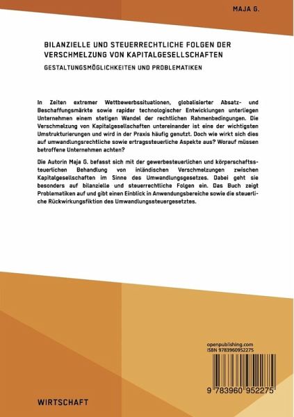 In Zeiten extremer Wettbewerbssituationen, globalisierter Absatz- und Beschaffungsmärkte sowie rapider technologischer Entwicklungen unterliegen Unternehmen einem stetigen Wandel der rechtlichen Rahmenbedingungen. Die Verschmelzung von Kapitalgesellschaften untereinander ist eine der wichtigsten Umstrukturierungen und wird in der Praxis häufig genutzt. Doch wie wirkt sich dies auf umwandlungsrechtliche sowie ertragssteuerliche Aspekte aus? Worauf müssen betroffene Unternehmen achten?Die Autorin Maja G. befasst sich mit der gewerbesteuerlichen und körperschaftssteuerlichen Behandlung von inländischen Verschmelzungen zwischen Kapitalgesellschaften im Sinne des Umwandlungsgesetzes. Dabei geht sie besonders auf bilanzielle und steuerrechtliche Folgen ein. Das Buch zeigt Problematiken auf und gibt einen Einblick in Anwendungsbereiche sowie die steuerliche Rückwirkungsfiktion des Umwandlungssteuergesetztes.Aus dem Inhalt:-Kapitalgesellschaft;-Verschmelzung;-Umsatzsteuer;-Körperschaftssteuer;-Umwandlungssteuergesetz;-Bilanzierung