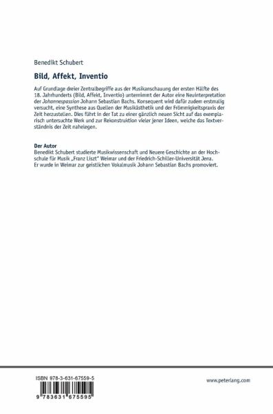 Auf Grundlage dreier Zentralbegriffe aus der Musikanschauung der ersten Hälfte des 18. Jahrhunderts (Bild, Affekt, Inventio) unternimmt der Autor eine Neuinterpretation der «Johannespassion» Johann Sebastian Bachs. Konsequent wird dafür zudem erstmalig versucht, eine Synthese aus Quellen der Musikästhetik und der Frömmigkeitspraxis der Zeit herzustellen. Dies führt in der Tat zu einer gänzlich neuen Sicht auf das exemplarisch untersuchte Werk und zur Rekonstruktion vieler jener Ideen, welche das Textverständnis der Zeit nahelegen.