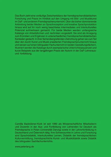 Das Buch zieht eine vorläufige Zwischenbilanz der fremdsprachendidaktischen Forschung und Praxis im Hinblick auf den Umgang mit Bild- und Musikkunst im DaF- und anderem Fremdsprachenunterricht. Über die bisher dominierende Anbindung beider Medien an Sprachrezeption und kreative Sprachproduktion hinaus wird auf ihr noch wenig beachtetes intermediales und interkulturelles Potenzial aufmerksam gemacht. Für beide Medien werden umfangreiche Kataloge von Arbeitsformen und -techniken vorgestellt. Sie sind als Anregung zum Erproben und Ergänzen in unterschiedlichen fremdsprachendidaktischen Kontexten gedacht. In ihrer fächerübergreifenden Zielrichtung gehen sie zum Teil über den durch Kunst und Musik erweiterten Fremdsprachenunterricht hinaus und weisen auf einen bilingualen Fachunterricht in beiden Gestaltungsfächern. Illustriert werden die Kataloge durch exemplarische Unterrichtssequenzen und kurze Beispiele aus der langjährigen Praxis der Autorin in der DaF-Lehreraus- und -fortbildung.