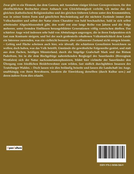 Zwar gibt es ein Element, das dem Ganzen, mit Ausnahme einiger kleiner Grenzprovinzen, für den oberflächlichen Beobachter einen Anhauch von Gleichförmigkeit verleiht, ich meine das des gleichen (katholischen) Religionskultus und des gleichen früheren Lebens unter den Krummstäben, was in seiner festen Form und gänzlichen Beschränkung auf die nächsten Zustände immer dem Volkscharakter und selbst der Natur einen Charakter von bald beschaulicher, bald in sich selbst arbeitender Abgeschlossenheit gibt, den wohl erst eine lange Reihe von Jahren und die Folge mehrerer, unter fremden Einflüssen herangebildeter Generationen völlig verwischen dürften. Das schärfere Auge wird indessen sehr bald von Abstufungen angezogen, die in ihren Endpunkten sich fast zum Kontraste steigern, und bei der noch großenteils erhaltenen Volkstümlichkeit dem Lande ein Interesse zuwenden, was ein vielleicht besserer, aber zerflossener Zustand nicht erregen könnte. ¿ Gebirg und Fläche scheinen auch hier, wie überall, die schärferen Grenzlinien bezeichnen zu wollen; doch haben, was das Volk betrifft, Umstände die gewöhnliche Folgenreihe gestört, und statt aus dem flachen, heidigen Münsterland, durch die hügelige Grafschaft Mark und das Bistum Paderborn, bis in die dem Hochgebirge nahestehenden Bergkegel des Sauerlandes (Herzogtum Westfalen) sich der Natur nachzumetamorphosieren, bildet hier vielmehr der Sauerländer den Übergang vom friedlichen Heidebewohner zum wilden, fast südlich durchglühten Insassen des Teutoburger Waldes. ¿ Doch lassen wir dies beiläufig beiseite und fassen die Landschaft ins Auge, unabhängig von ihren Bewohnern, insofern die Einwirkung derselben (durch Kultur usw.) auf deren äußere Form dies erlaubt.