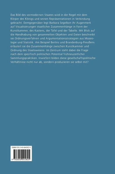 Das Bild des vormodernen Staates wird in der Regel mit der Repräsentation des Königskörpers in Verbindung gebracht. Demgegenüber legt die Autorin ihr Augenmerk auf Visualisierungen staatlicher Zusammenhänge in Form der Kunstkammer, des Setzkastens, der Staatstafel und der Tabelle, die das Bild des Staates zu konstruieren suchten. Mit Blick auf die Handhabung von gesammelten Objekten und Informationen beschreibt sie Ordnungsverfahren und Argumentationsstrategien aus Museologie und Statistik. Im Zentrum steht dabei die Frage nach dem spezifisch politischen Potential frühneuzeitlicher Sammlungspraktiken. Inwiefern bilden diese gesellschaftspolitische Verhältnisse nicht nur ab, sondern produzieren sie selbst mit? Welche Argumentationstopoi tauchen in den museologischen und staatsbeschreibenden Texten wiederholt auf? Wie wurden vor dem Hintergrund von Ordnungsbestrebungen Daten und Objekte in funktionale Kontexte gesetzt? Dass Museologie und Staatsbeschreibung in der Entwicklung parallel verliefen und ähnliche Ordnungs- und Überblickssysteme entwarfen, wird an den Positionen der Autoren Samuel Quiccheberg, Johann Daniel Major, Gottfried Wilhelm Leibniz, Carl von Linné und Friedrich Anton von Heinitz anschaulich gemacht. Im zweiten Schritt werden die Zusammenhänge zwischen Kunstkammer und Ordnung des Staatswesens am Beispiel Berlins und Brandenburg-Preußens herausgearbeitet. Die inventarisierende und historisierende Erfassung und Ordnung der Besitztümer des Souveräns diente zwar einem propagandistischen Zweck, im Feld der politischen Vorgaben wurden jedoch Formen eines (politischen) Wissens sichtbar, das sich der monarchischen Kontrolle entzog und sich als Staatsgewalt verselbständigte.
